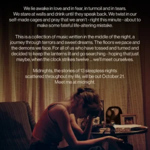 Fue en la noche de los MTV VMAs 2022 cuando la cantante sorprendió al público con el anuncio de su nuevo álbum, al aceptar el premio al video del año. En ese momento, Taylor Swift reveló que su décimo álbum de estudio, «Midnights», estará disponible el 21 de octubre y lo describió como «las historias de 13 noches de insomnio que he tenido a lo largo de su vida«.